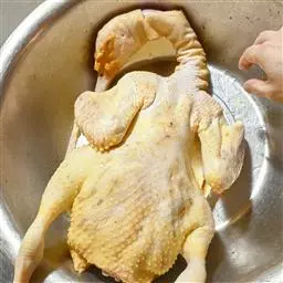 1.鸡宰杀洗净,把鸡的嘴巴从翅膀下穿过去,然后把鸡放入热水中浸30分钟,注意用小火,保证锅里的水不会沸腾,利用水的热度把鸡浸透、泡熟,这样鸡肉会比较嫩,