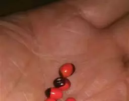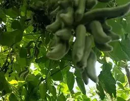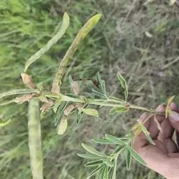 荚果带状,长10-18厘米,宽1.4-3厘米,顶端凸尖,基部有柄,纵裂,被微柔毛;种子6-25颗,卵形,长约7.5毫米,褐色,扁平,光亮。花期4-7月;果期8-10月。