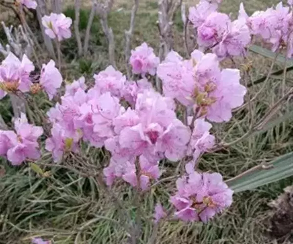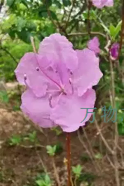 花序腋生枝顶或假顶生,1-3花,先叶开放,伞形着生;花芽鳞宿存;花梗长5-10毫米,疏生鳞片;花萼长0.5-1毫米,5裂,被鳞片,无毛或疏生刚毛;花冠宽漏斗状,长2.3-2.8厘米,径3-4厘米,淡红紫色,外面被短柔毛,无鳞片;雄蕊10,不等长,稍短于花冠,花丝下部被短柔毛;子房5室,密被鳞片,花柱光滑,长于花冠。