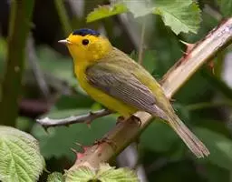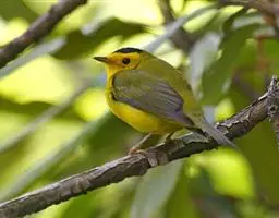黑脸鹟莺:体长10厘米,是有特色的体小而多彩的莺鸟。粗眉纹,颏、喉及尾下覆羽黄色,脸罩黑,…