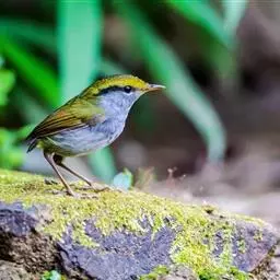金冠地莺:形态与灰腹地莺相似,上体橄榄绿,前额至头顶渲染亮金黄色;下体几乎纯暗石板灰色,…