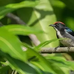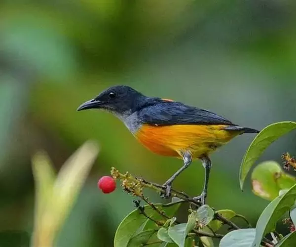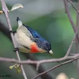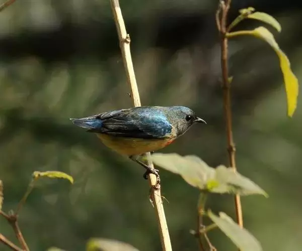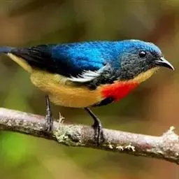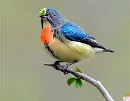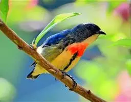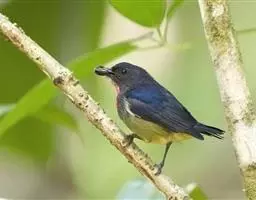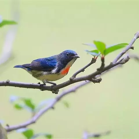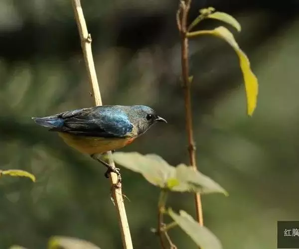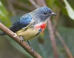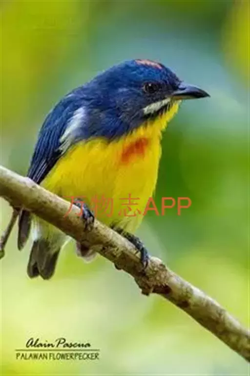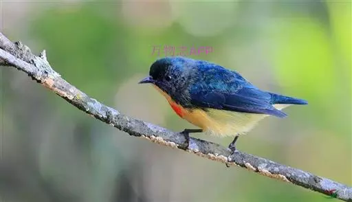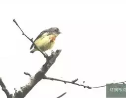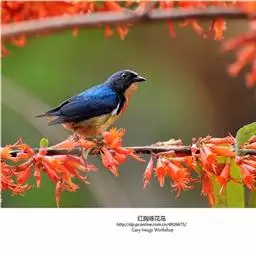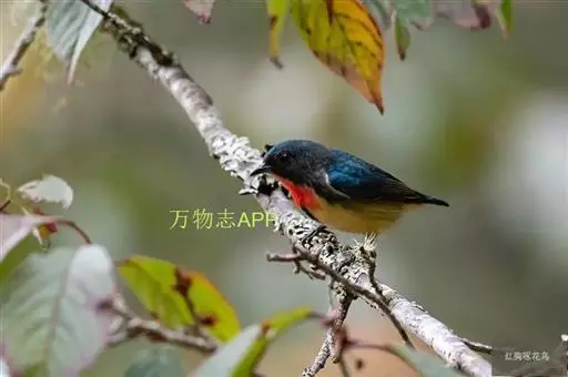 红胸啄花鸟(学名:Dicaeum ignipectus):体重5-10克,体长60-92毫米。体形纤小。雄鸟上体呈辉亮的金属绿色;下体棕黄,胸部具一朱红色块斑,极易与其他啄花鸟区别。雌鸟上体呈橄榄绿,下体棕黄色。虹膜褐色,嘴褐黑色或角灰色,跗蹠暗褐色。幼鸟上嘴褐黑,下嘴红色;跗蹠呈铅灰色。