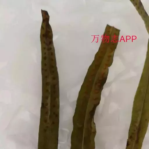 药材性状:常多株卷成团。根茎横生,柱状,被多数须根与鳞片。叶线状披针形,土黄色至绿色,卷曲皱缩,沿两边向背面反卷。孢子囊群10~20余个,于叶背面排列成2行,味淡弱,根茎味苦。以干燥、绿色、背面有棕色孢子囊群者为佳。