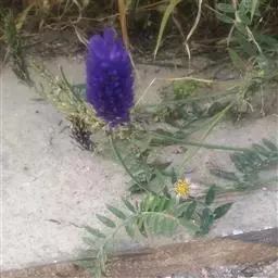 花序腋生,有花10-30朵,组成密集的总状或小头状花序,总花梗长3-7厘米,被白色柔毛和腺点;苞片膜质,披针形,长3毫米,被绒毛和腺点;花梗长约1毫米;花萼长4-6毫米,被白色柔毛和腺点,萼齿披针形,下方一个较长,花冠黄色或蓝色,花瓣明显具瓣柄,旗瓣倒卵形,长5.5毫米;雄蕊10,上部分离。