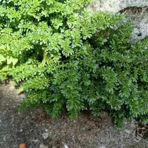 泡叶冷水花 Wedd.Pilea nummulariifollia)是尊麻科冷水花属的多年生常绿草本植物。匍匐蔓生,分枝细而多,全株被短而细的绒毛。叶对生,圆形,质薄,叶缘具半圆形锯齿,脉间叶肉凸起,看上去成泡状,且具短粗毛,具托叶,薄、半透明状,花小不明显。花期为秋季。泡叶冷水花原产热带美洲,西印度群岛及巴拿马等地,在中国南方多见;喜好半日照照耀生长,适合温度为20℃-28℃,喜富含腐殖质的壤土,且喜高温多湿,在南方温暖地区,只要湿度够,即生长良好;繁殖方式一般以扦插繁殖为主,除冬季外,随时可进行。泡叶冷水花叶色青翠,多作吊盆种植,枝蔓下垂十分美观。也可作地被种植;泡叶冷水花吸收二氧化碳的能力比花卉高2.5倍,并且还能消除室内装材料和家具散发的甲醛和二氧化硫等害气体,能吸收净化烹饪时散发出来油烟,迅速净化居室空气,具有抗污吸毒的功能,是经济实惠的天然空气清新剂,被称之为“抗污新星;还是良好的切叶材料。