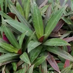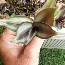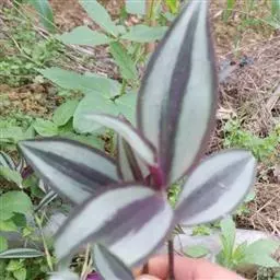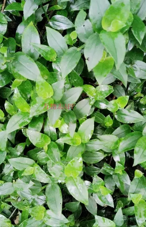 多年生常绿草本。茎匍匐,光滑,长可达60cm,带紫红色晕,有略膨大节,节处易生根。叶互生,长圆形或卵状长圆形,先端尖,下面深紫堇色,仅叶鞘上端有毛,具白色条纹。花小,多朵聚生成伞形花序,白色,为2叶状苞片所包被,花期夏、秋季。