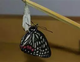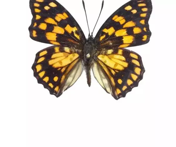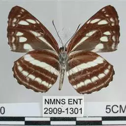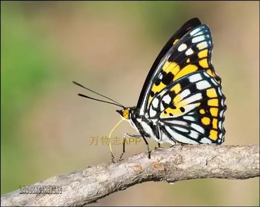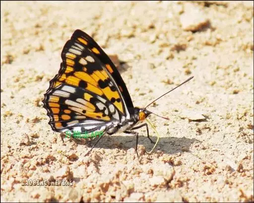 与帅蛱蝶近似,但雄蝶翅面黑色,所有条斑均橙黄色,无白色条斑,前翅中室内有二个橙黄色斑,前翅中域Cu1室斑眼状。雌蝶条斑的排列图案同雄蝶,但除前翅中室有二个黄色斑外,其余条斑均为白色。
