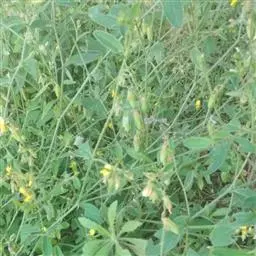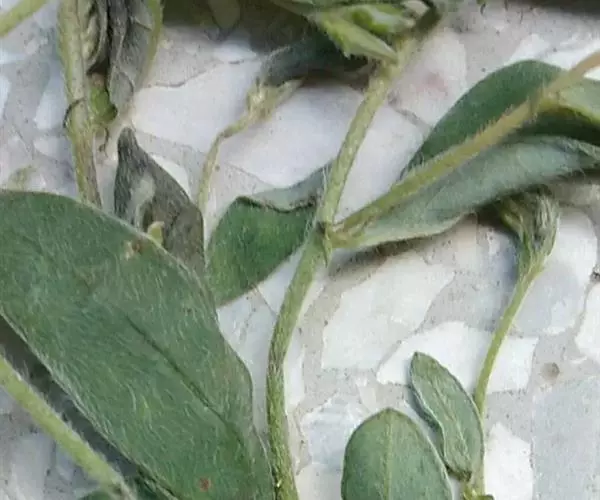 干燥全草,茎圆形,全体有黄棕色茸毛。叶片卷曲,多脱落,呈椭圆形或卵形,黄绿色。枝端尚带荚果,种子大多脱落。带根者,根蜿蜒而长,圆形,少分枝,须根细长,表面土黄色。