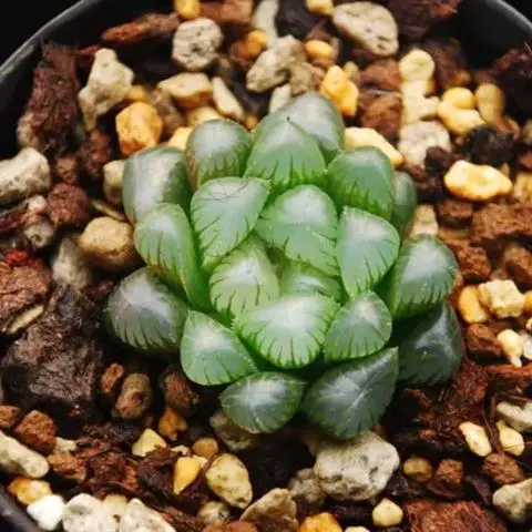 樱水晶,多年生肉质草本植物,肉质叶呈紧凑的莲座状排列,叶片肥厚饱满,翠绿色,上半段呈透明或半透明状,有深色的线状脉纹,在阳光较为充足的条件下,其脉纹为褐色,叶顶端有细小的“须”。 盛花期在春秋季。