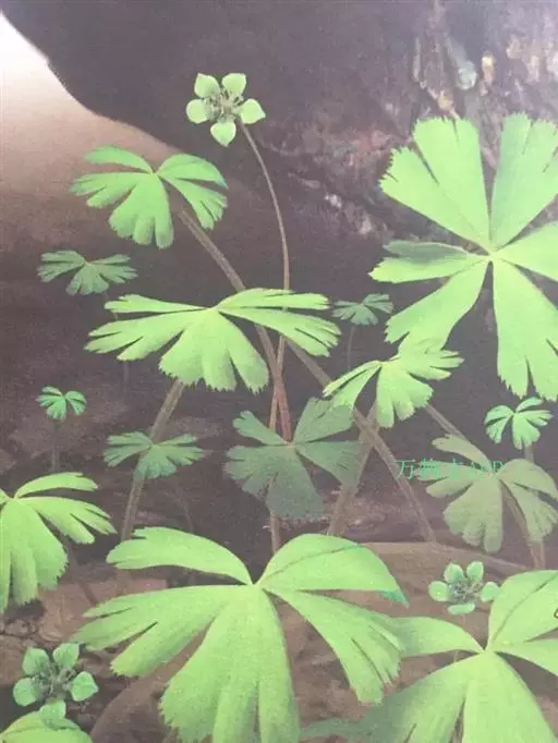独叶草 叶基生,有长柄,叶片心状圆形,宽3.5-7厘米,五全裂,中、侧全裂片三浅裂,最下面的全裂片不等二深裂,