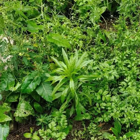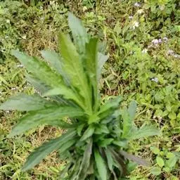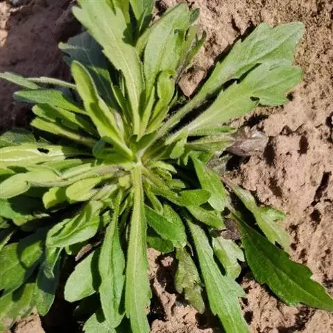 一年生或二年生草本,根纺锤状,直或弯,具纤维状根。茎粗壮,直立,高80-150厘米,基部径4-6毫米,具条棱,绿色或下部红紫色,中部或中部以上有长分枝,被较密灰白色上弯糙短毛,杂有开展的疏柔毛。叶密集,基部叶花期凋落,下部叶倒披针形或披针形,长6-10厘米,宽1-3厘米,顶端尖或渐尖,基部渐狭成柄,边缘上部每边常有4-8个粗齿,基部全缘,中部和上部叶渐小,狭披针形或近线形,具齿或全缘,两面特别下面被密糙短毛。