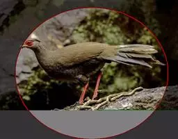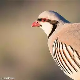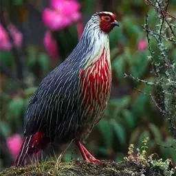 体大的灰褐色鹑类。胸灰色具黑色细纹。与相似种类四川雉鹑不同处在于栗色喉块外缘近白。有猩红色眼周裸皮。…