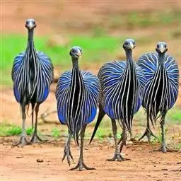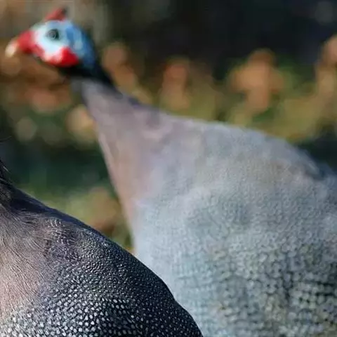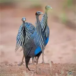 鹫珠鸡:是珠鸡科中体形最大的一种,因头颈部像兀鹫而得名。雌雄羽色相似,为黑色基底上遍布白色点斑,…