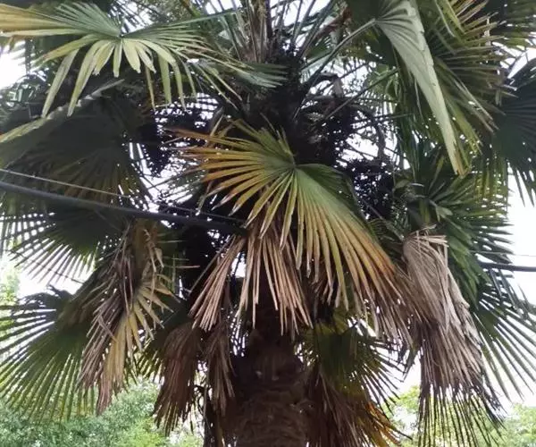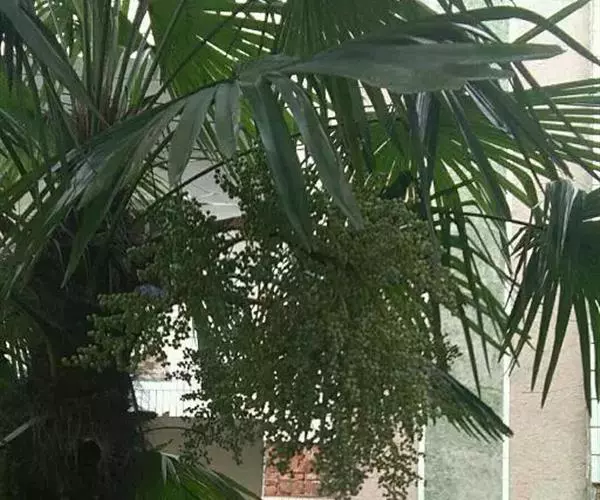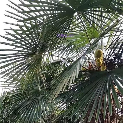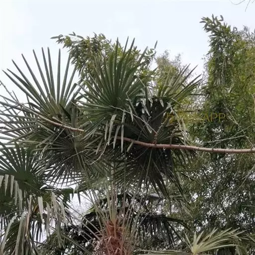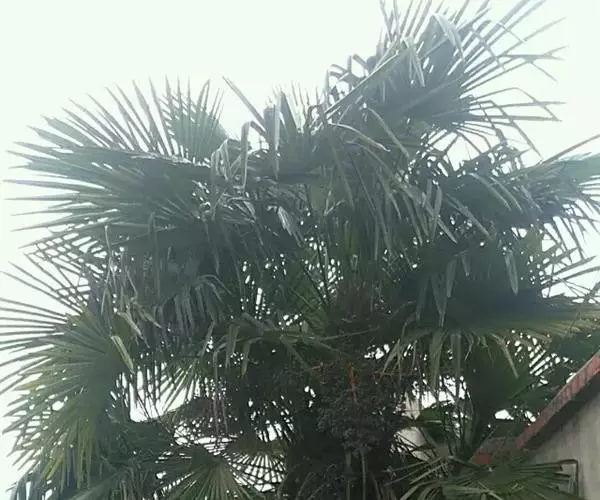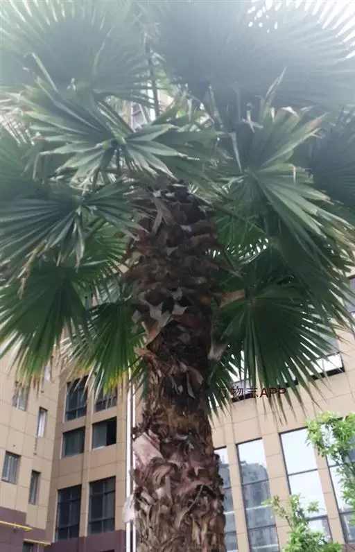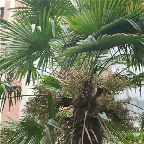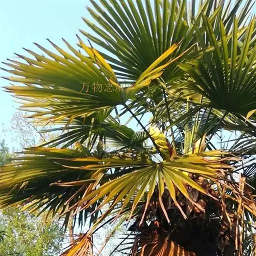 棕榈(学名:Trachycarpus fortunei (Hook.) H. Wendl.)属棕榈科常绿乔木,高可达7米;干圆柱形,叶片近圆形,叶柄两侧具细圆齿,花序粗壮,雌雄异株。花黄绿色,卵球形;果实阔肾形,有脐,成熟时由黄色变为淡蓝色,有白粉,种子胚乳角质。花期4月,果期12月