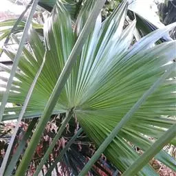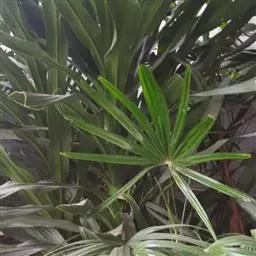 细叶棕竹,灌木,茎细如竹,多数聚生,有网状叶鞘。叶半圆形,掌状深裂,裂片狭长,阔线形,软垂,裂片7…