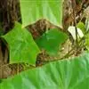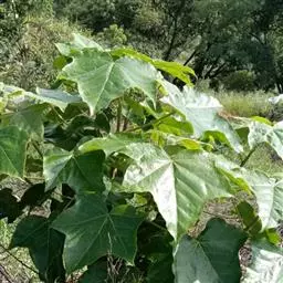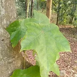 常绿乔木,高达30米,嫩枝有褐色柔毛,老枝变秃净,节膨大,有环状托叶痕。叶革质,阔卵形,长8-13厘米,宽5-9厘米,先端渐尖,基部阔楔形,全缘或幼叶为掌状3浅裂,上面深绿色,发亮,下面无毛,常有细小瘤状突起,掌状脉3-5条,在上面很显著,在下面隆起;叶柄长3-5厘米,初时有柔毛,以后变秃净;托叶狭矩圆形,稍弯曲,长2-4厘米,宽8-13毫米,被柔毛,早落。