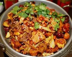 炒干兔肉水分,下葱和姜爆香,加入干花椒、干辣椒、花生、盐、鸡粉、白糖、香油、白芝麻翻炒。
