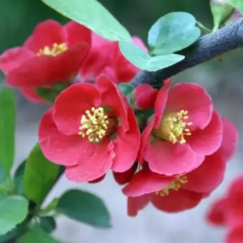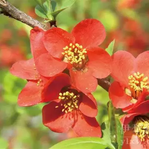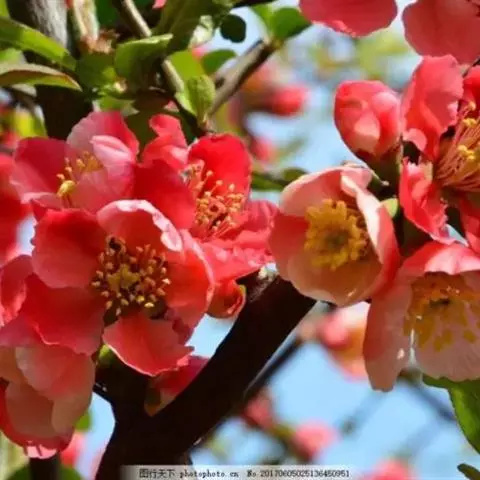 落叶灌木,高达2米,枝条直立开展,有刺;小枝圆柱形,微屈曲,无毛, 皱皮木瓜 紫褐色或黑褐色,有疏生浅褐色皮孔;冬芽三角卵形,先端急尖,近于无毛或在鳞片边缘具短柔毛,紫褐色。叶片卵形至椭圆形,稀长椭圆形,长3-9厘米,宽1.5-5厘米,先端急尖稀圆钝,基部楔形至宽楔形,边缘具有尖锐锯齿,齿尖开展,无毛或在萌蘖上沿下面叶脉有短柔毛;叶柄长约1厘米;托叶大形,草质,肾形或半圆形,稀卵形,长5-10毫米,宽12-20毫米,边缘有尖锐重锯齿,无毛。花先叶开放,3-5朵簇生于二年生老枝上;花梗短粗,长约3毫米或近于无柄;花直径3-5厘米;萼筒钟状,外面无毛;萼片直立,半圆形稀卵形,长3-4毫米。宽4-5毫米,长约萼筒之半,先端圆钝,全缘或有波状齿,及黄褐色睫毛;花瓣倒卵形或近圆形,基部延伸成短爪,长10-15毫米,宽8-13毫米,猩红色,稀淡红色或白色;雄蕊45-50,长约花瓣之半;花柱5,基部合生,无毛或稍有毛,柱头头状,有不显明分裂,约与雄蕊等长。果实球形或卵球形,直径4-6厘米,黄色或带黄绿色,有稀疏不显明斑点,味芳香;萼片脱落,果梗短或近于无梗。花期3-5月,果期9-10月。