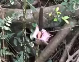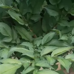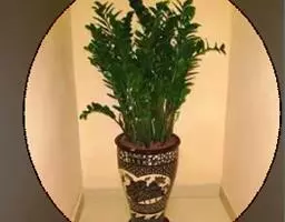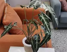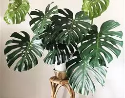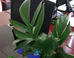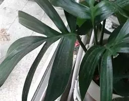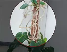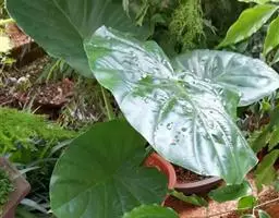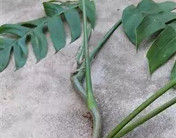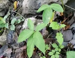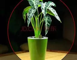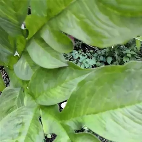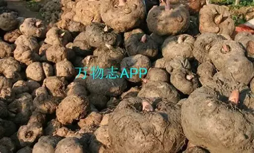 魔芋地下块茎为扁球形,个大,叶柄粗壮,圆柱形,淡绿色,有暗紫色斑,掌状复叶,里面是白色的。