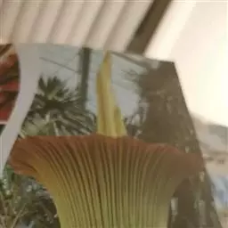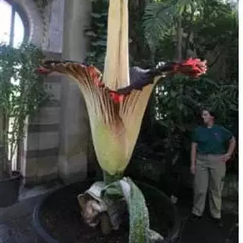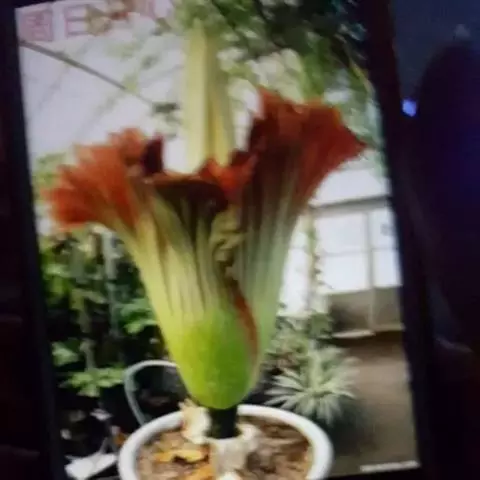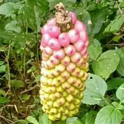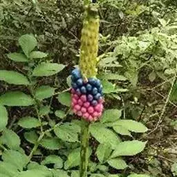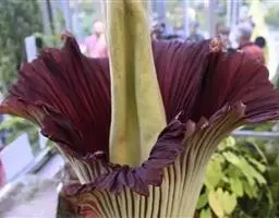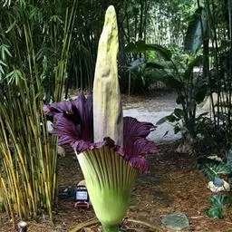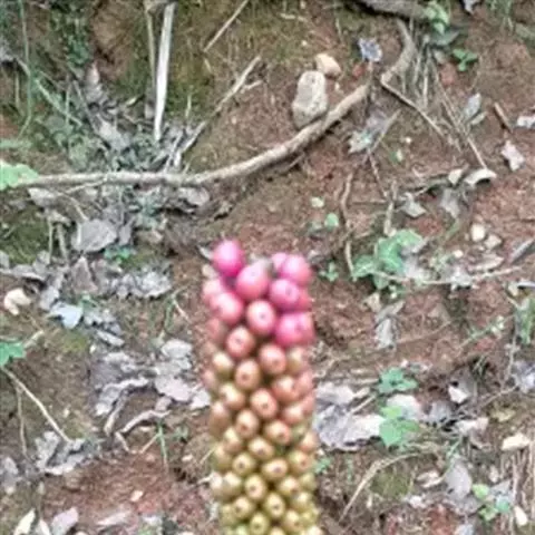 株高约40~70公分,地下有球茎,一株只长一叶,羽状复叶,叶柄粗长似茎,开花紫红色,有异臭味,地下球茎圆形。