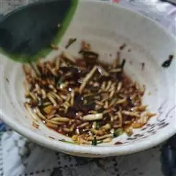再添加之前备好的混和酱汁、红辣油,撒上咸辣萝卜丁、香葱末,依个人口味调点山西老陈醋,更鲜香。