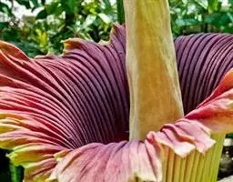 花序柄长15-30厘米,粗1-3厘米,绿色,粗糙。佛焰苞厚革质,宽卵形,舟状,近直立,先端具喙,长20-25厘米,人为展平宽15-17.5厘米,苍白带黄色。肉穗花序近圆柱形,长17.5-20厘米,粗4-5厘米,淡黄色。雄蕊花丝线形,花粉黄白色。雌蕊陀螺状,长7-8毫米,柱头小,线形,纵向,黄色,稍凸起。浆果淡黄色,柱头周围有青紫色斑点,长1厘米,粗7.5毫米。花期8-9月,果于异年花期之后成熟。
