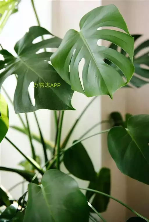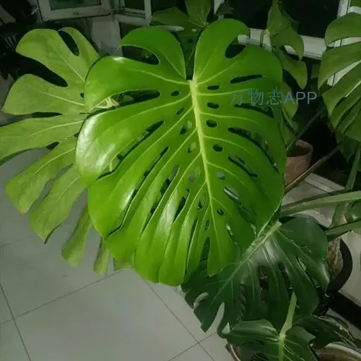 龟背竹叶形奇特,孔裂纹状,极像龟背。茎节粗壮又似罗汉竹,深褐色气生根,纵横交差,形如电线。其叶常年碧绿,茎粗壮,节上有较大的新月形叶痕,生有索状肉质气生根,极为耐阴,是室内大型盆栽观叶植物。