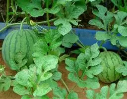 盘头掐尖。西瓜进入膨大期,瓜前藤要适当抑制,不可使其旺盛生长,不然会损耗养分,影响瓜膨大。盘头掐尖是把瓜前藤拉回来,圈在西瓜一边,并随手掐藤尖。