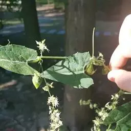 一年生蔓生藤本;茎、枝粗壮,具明显的棱沟,被长而密的白 色或淡黄褐色长柔毛。卷须较粗壮,具短柔毛,2歧,叶柄粗,长3-12厘米,粗0.2-0.4厘米,具不明显的沟纹,密被柔毛;叶片纸质,轮廓三角状卵形,带白绿色,长8-20厘米,宽5-15厘米,两面具短硬毛,脉上和背面较多,3深裂,中裂片较长,倒卵形、长圆状披针形或披针形,顶端急尖或渐尖,裂片又羽状或二重羽状浅裂或深裂,边缘波状或有疏齿,末次裂片通常有少数浅锯齿,先端钝圆,叶片基部心形,有时形成半圆形的弯缺,弯缺宽1-2厘米,深0.5-0.8厘米。