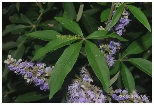 灌木,高2-3米;小枝四棱形,被灰白色绒毛。掌状复叶,对生,叶柄长2-7厘米,小叶4-7,小叶片狭披针形,有短柄或近无柄;中间的小叶片5-9厘米,宽1-1.7厘米,通常全缘,顶端渐尖,基部楔形,表面绿色,背面密被灰白色绒毛和腺点;两侧的小叶依次渐刁。