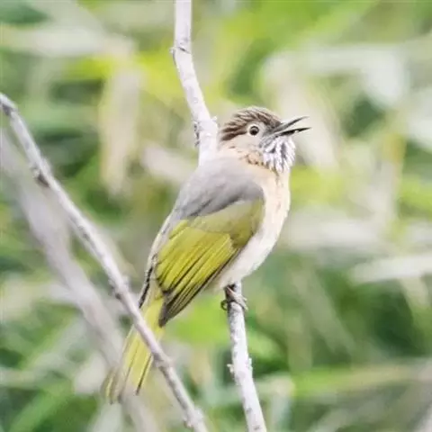 灰短脚鹎(学名:Hemixos flavala),体长19-22cm。头顶和短的羽冠黑色,上体暗灰色,耳羽灰褐色,两翅表面橄榄绿黄色。大覆羽和内侧飞羽外翈橄榄黄色,在翅上形成大块绿黄色斑,在灰色的上体极为醒目。尾暗褐色具橄榄绿色羽缘。颏、喉及腹部中央和尾下覆羽白色,胸和两胁深灰色。主要以植物性食物为食,尤以植物果实和种子为主。