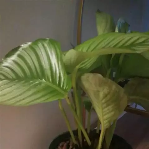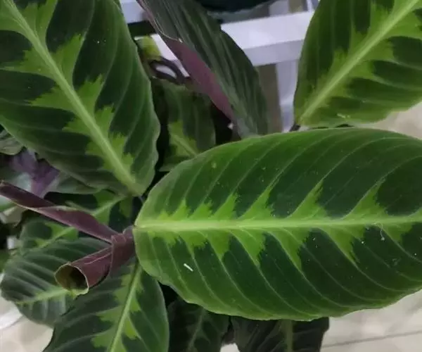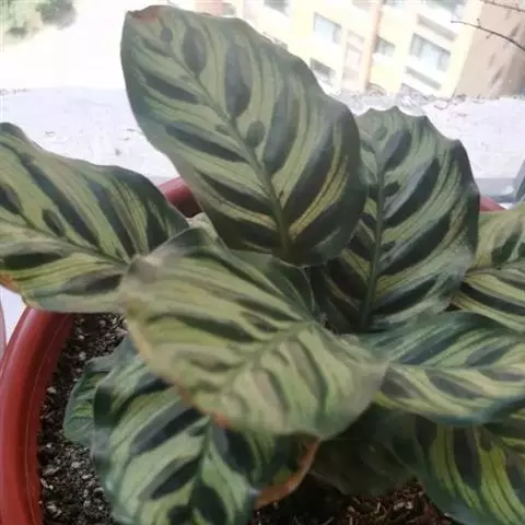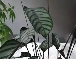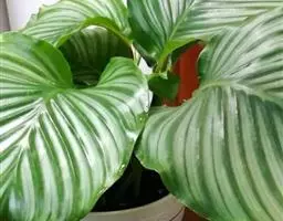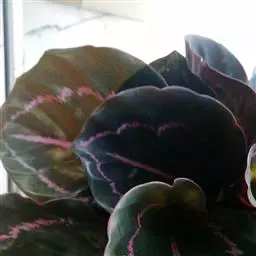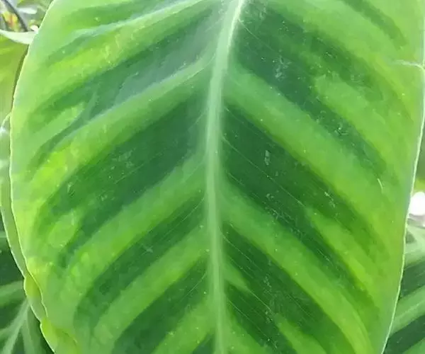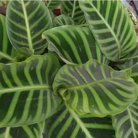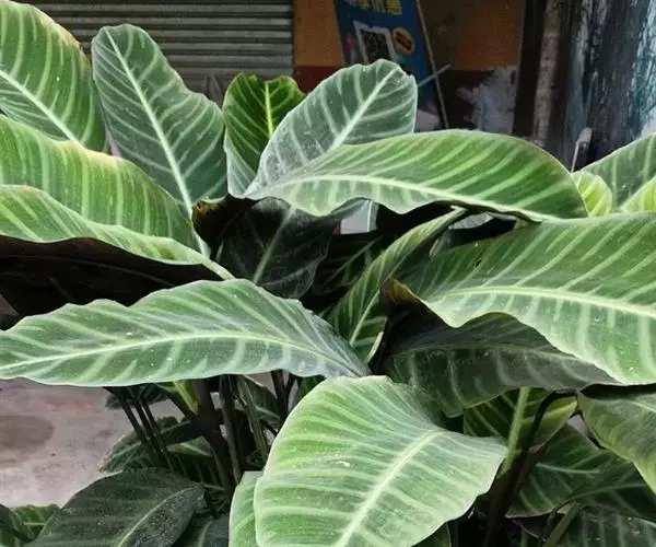 绒叶肖竹芋〔学名:Calathea zebrina (Sims) Lindl.〕是竹芋科,肖竹芋属多年生中等大草本植物,株高可达1米。叶片长圆状披针形,不等侧,叶面深绿,有黄绿色的条纹,天鹅绒般,叶背幼时浅灰绿色,老时淡紫红色,头状花序,花冠紫堇色或白色,子房无毛。5-6月开花。