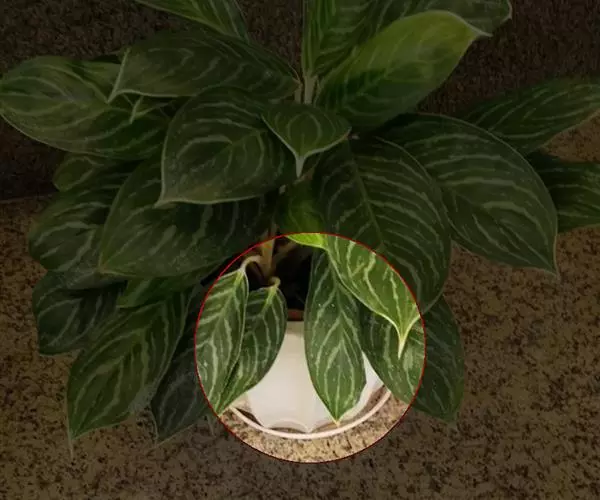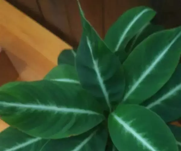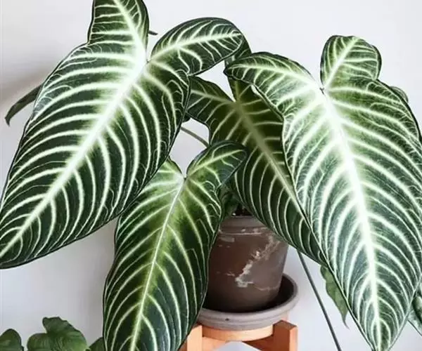 叶片6-20片,长圆状披针形,长达45厘米,宽达16厘米,不等侧,顶端钝,基部渐尖,叶面深绿,间以黄绿色的条纹,天鹅绒一般,十分美丽,叶背幼时浅灰绿色,老时淡紫红色,两面均无毛;叶柄长达45厘米。