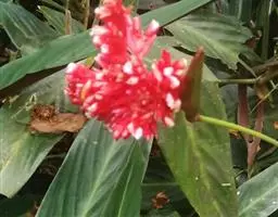 头状花序卵形,鹅蛋般大小,单独生于花葶上,花葶长短不一,苞片覆瓦状排列,宽卵形,宽约5厘米,里面的紫色;小苞片线形;萼片长圆形,长达2.5厘米;花冠紫堇色或白色,裂片长圆状披针形,长1.5厘米;外轮退化雄蕊倒卵状长圆形,淡紫茧色,长1.7厘米;硬革质的1枚与其相似,兜状的1枚长仅及其半;子房无毛。花期:5-6月。