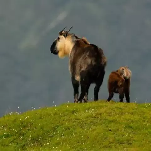 羚牛(学名:Budorcas taxicolor):体形粗大,肩高110-120厘米,雄性体重可达400千克,最大者肩高可达2米,重达1吨。雌雄均具短角。是一种分布在喜马拉雅山东麓密林地区的大型牛科食草动物。由于产地不同,毛色由南向北逐渐变浅。分为4个亚种:高黎贡羚牛、不丹羚牛、四川羚牛、秦岭羚牛,中国均产。