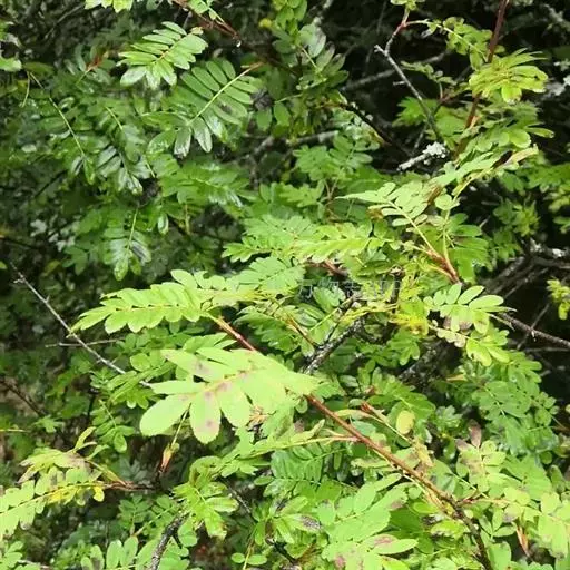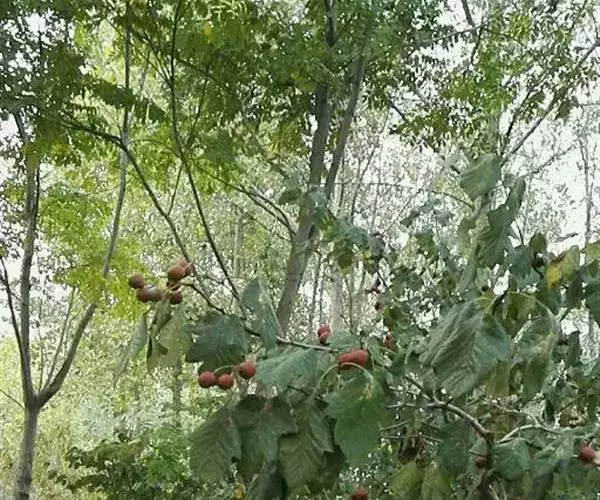 小叶5-9,长圆形或倒卵长圆形,锯齿在前半部,基部全缘,两面无毛;果实梨形,果梗较短,稍膨大,红色。