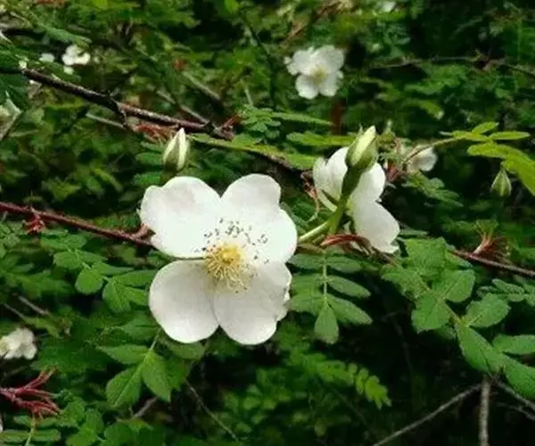 刺蔷薇:灌木,高1-3米;小枝圆柱形,稍微弯曲,红褐色或紫褐色,无毛,有细直皮刺。小叶片宽椭圆形或…