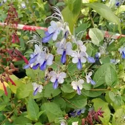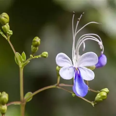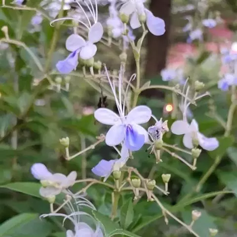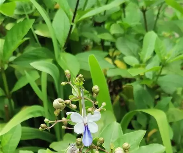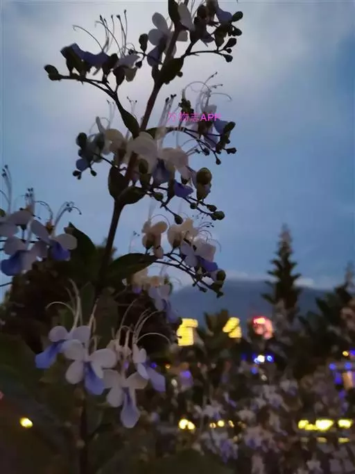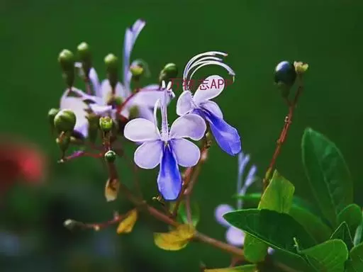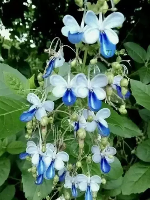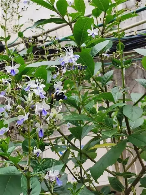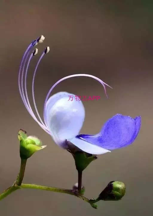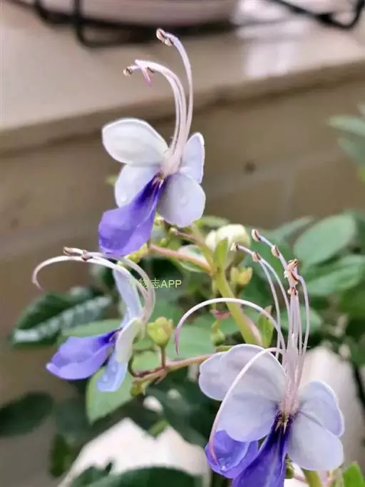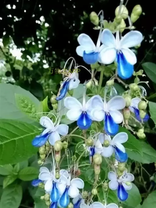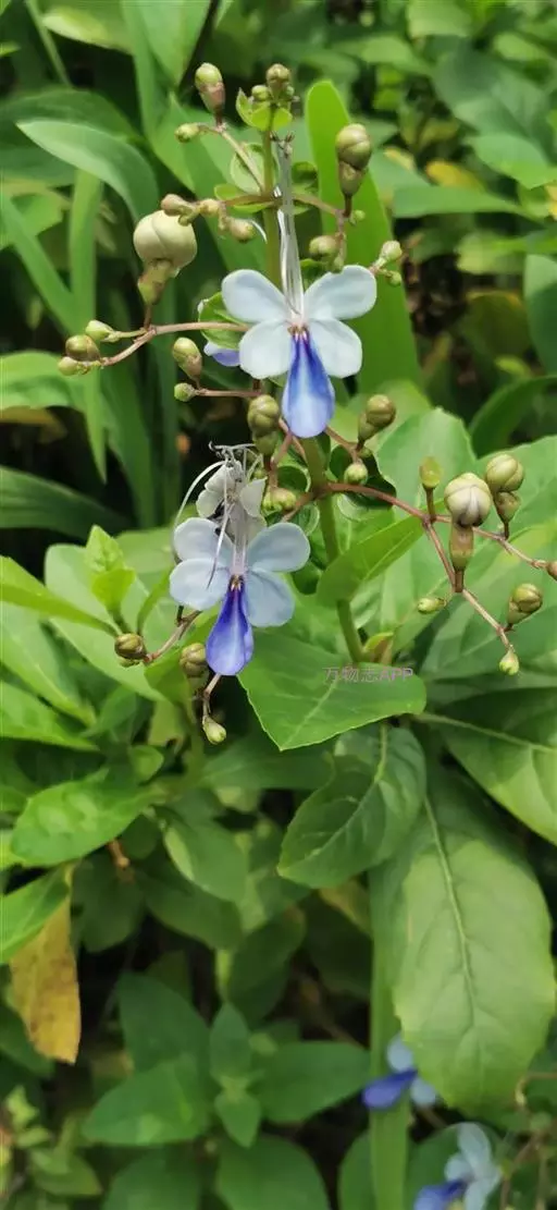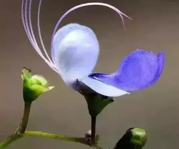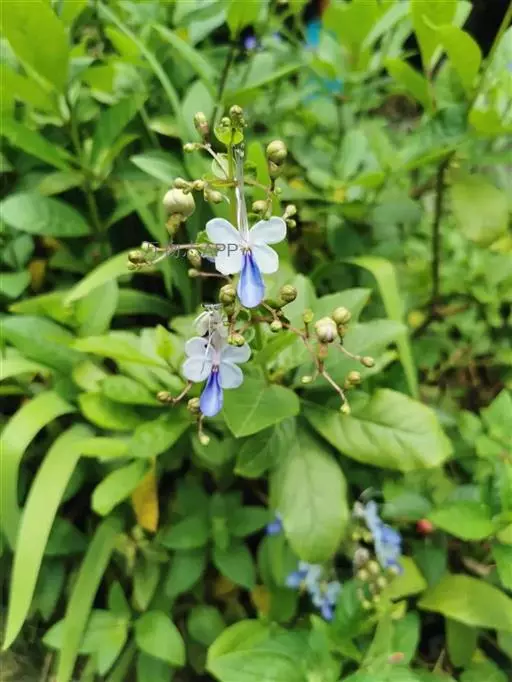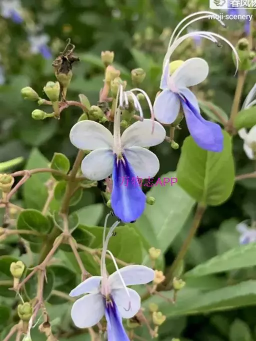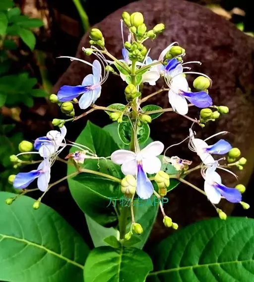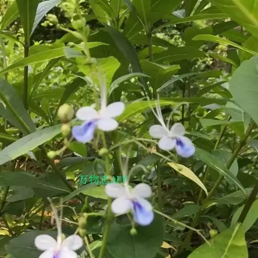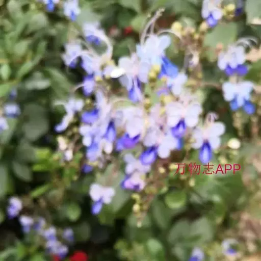 花:花朵造形似蝴蝶,花色为浅蓝到紫色,花瓣平展花冠两侧对称,花冠白色,唇瓣紫蓝色,雄蕊细长。