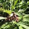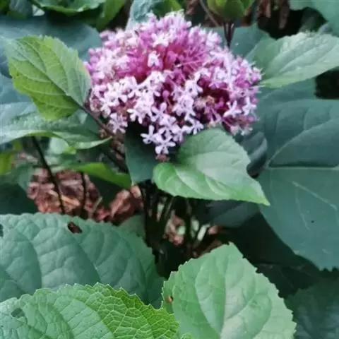 圆锥花序顶生.杯形花萼5裂,裂片圆形,绿带紫色。
