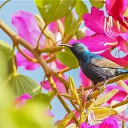 叉尾太阳鸟性情活跃不畏人,行动敏捷,总是不停地在枝梢间跳跃飞行 ;多常单独活动,有时成对,或亦有结二十只左右的小群 。