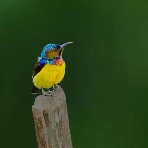 叉尾太阳鸟体型纤细;嘴细长下弯,上下嘴缘先端约1/3呈细锯齿状;翼短圆,第一枚初级飞羽短小,尾呈楔形;跗蹠纤细而长,具盾状鳞 [11-12] 。雄性成鸟体重5.0~7.0克,全长9.5~11.5厘米,翅4.5~5.5厘米,尾4.0~5.2厘米;雌鸟体重4.5~7.0克,全长7.9~10.0厘米,翅4.2~4.8厘米,尾2.5~3.0厘米 。