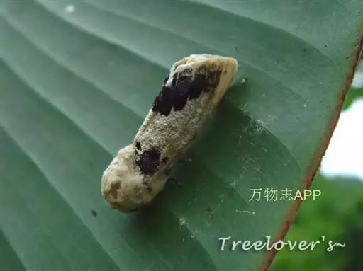苹掌舟蛾幼虫图 5龄,末龄幼虫体长55mm左右,被灰黄长毛。头、前胸盾、臀板均黑色。胴部紫黑色,背线和气门线及胸足黑色,亚背线与气门上、下线紫红色。体侧气门线上下生有多个淡黄色的长毛簇。