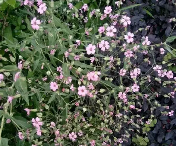 一年生或二年生草本,高30-70厘米,全株无毛,微被白粉,呈灰绿色。根为主根系。茎单生,直立,上部分枝。叶片卵状披针形或披针形,长3-9厘米,宽1.5-4厘米,基部圆形或近心形,微抱茎,顶端急尖,具3基出脉。伞房花序稀疏;花梗细,长1-4厘米;苞片披针形,着生花梗中上部;花萼卵状圆锥形,长10-15毫米,宽5-9毫米,后期微膨大呈球形,棱绿色,棱间绿白色,近膜质,萼齿小,三角形,顶端急尖,边缘膜质;雌雄蕊柄极短;花瓣淡红色,长14-17毫米,宽2-3毫米,爪狭楔形,淡绿色,瓣片狭倒卵形,斜展或平展,微凹缺,有时具不明显的缺刻;雄蕊内藏;花柱线形,微外露。蒴果宽卵形或近圆球形,长8-10毫米;种子近圆球形,直径约2毫米,红褐色至黑色。花期5-7月,果期6-8月。