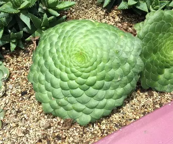 明镜(学名:Aeonium tabuliforme (Haw.) Webb & Berthel.)别名盘叶莲花掌,是景天科、莲花掌属植物,植株低矮,由100~200枚肉质叶组成莲座状叶盘,其最大直径可达50厘米。叶片无柄,匙形,叶色草绿至灰绿、深绿,叶缘有白色纤毛;叶片全部由中心水平向周围辐射生长,使整个叶盘平齐如镜,没有一丝空隙;由于叶缘颜色稍深并有白色纤毛,同时外轮叶大,内轮叶小,故镜面般的叶盘就像一幅精美绝伦的几何图案,非常奇特。