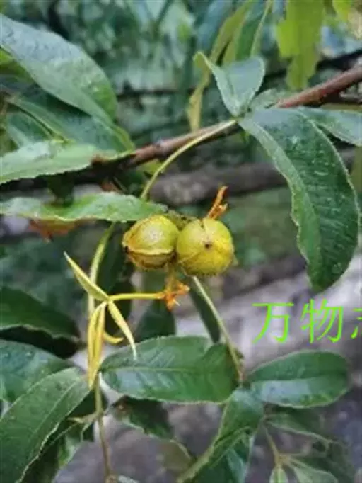 乔木,高达10-20米,胸径30-60厘米 山核桃生长期果实 ;树皮平滑,灰白色,光滑;小枝细瘦,新枝密被盾状着生的橙黄色腺体,后来腺体逐渐稀疏,1年生枝紫灰色,上端常被有稀疏的短柔毛,皮孔圆形,稀疏。 复叶长16-30厘米,叶柄幼时被毛及腺体,后来毛逐渐脱落,叶轴被 毛较密且不易脱落,有小叶5-7枚;小叶边缘有细锯齿,幼时上面仅中脉、侧脉及叶缘有 柔毛,下面脉上具宿存或脱落的毛并满布橙黄色腺体,后来腺体逐渐稀疏;侧生小叶具短的小叶柄或几乎无柄,对生,披针形或倒卵状披针形,有时稍成镰状弯曲,基部楔形或略成 圆形,顶端渐尖,长10-18厘米,宽2-5厘米,顶生小叶具长约5-10毫米的小叶柄,同上端的侧生小叶同形、同大或稍大。 雄性葇荑花序3条成1束,花序轴被有柔毛及腺体, 长10-15厘米,生于长约1-2厘米的总柄上,总柄自当年生枝的叶腋内或苞腋内生出。 雄花具短柄;苞片狭,长椭圆状线形,小苞片三角状卵形,均被有毛和腺体;雄蕊2-7枚, 着生于狭长的花托上,花药具毛。雌性穗状花序直立,花序轴密