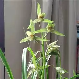 花茎直立,高20至30厘米,有花2至5朵,有时7朵, 花苞片比子房连梗长;花直径5至6厘米,浅黄绿色,常呈半透明状,有香味。萼片长圆形披针状, 春剑 中萼片直立稍向前倾,侧萼片左右斜向开展,花瓣较萼片为短,基部有三条紫红色条斑,唇瓣端钝、反卷。春剑叶姿挺拔苍健,秀气非凡,颇具风韵。