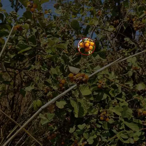 果实近球形,多汁液,直径1-1.4厘米,红色或橙黄色,密被短绒毛;核具明显洼孔。花期5-6月,果期8-9月。