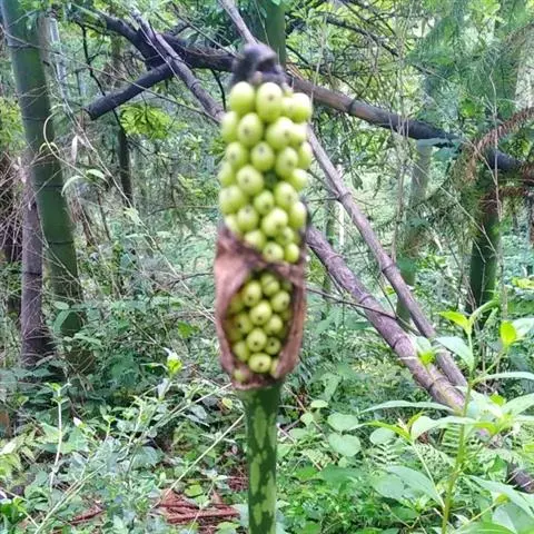 花序柄长15-30厘米,粗1-3厘米,绿色,粗糙。佛焰苞厚革质,宽卵形,舟状,近直立,先端具喙,长20-25厘米,人为展平宽15-17.5厘米,苍白带黄色。肉穗花序近圆柱形,长17.5-20厘米,粗4-5厘米,淡黄色。雄蕊花丝线形,花粉黄白色。雌蕊陀螺状,长7-8毫米,柱头小,线形,纵向,黄色,稍凸起。浆果淡黄色,柱头周围有青紫色斑点,长1厘米,粗7.5毫米。花期8-9月,果于异年花期之后成熟。