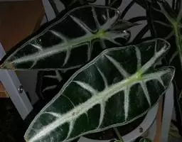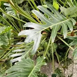 叶柄绿色,长常达1米,腹面扁平,宽4-5厘米,背面钝圆,粗糙,边缘锐尖,基部甚宽,对折抱茎,排列为覆瓦状,形如鸢尾,两侧叶鞘宽,向上渐狭,脱落后叶柄边缘成绉波状;叶片大,轮廓心状卵形,宽40-60厘米,厚革质,表面发亮,淡绿色,背面绿白色,边缘羽状分裂,侧脉间有1-2个较大的空洞,靠近中肋者多为横圆形,宽1.5-4厘米,向外的为横椭圆形,宽5-6厘米;中肋及侧脉表面绿色,背面绿白色,两面均隆起;I次侧脉8-10对,基部的相互靠近,向上渐远离,II、III、IV级叶脉网状,不明显。