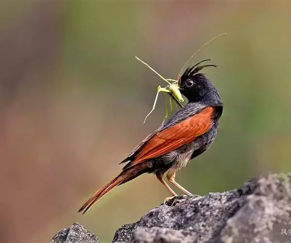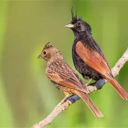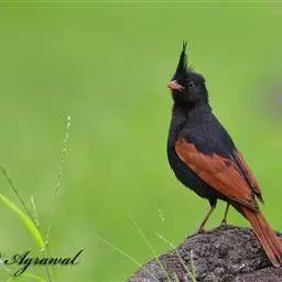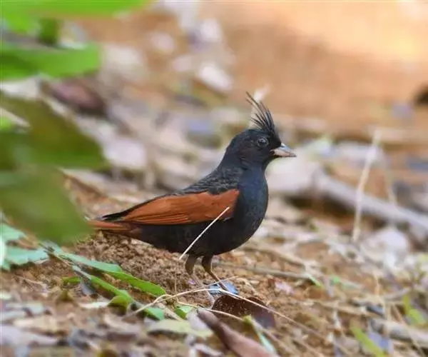 凤头鹀(学名:Emberiza lathami):属小型鸣禽,体重21-31克,体长134-175毫米。以头顶的细长羽冠为特征,雄鸟全身几乎均为黑色具蓝色光泽,两翅和尾以及尾上覆羽栗红色。雌鸟具短的褐色羽冠,上体暗橄榄褐色,两翅暗褐色具栗色或栗红色羽缘。尾暗褐色,最外侧一对尾羽几乎全为栗色或栗红色,次一对的外侧尾羽具大的楔状白斑。下体污皮黄色或暗褐皮黄色,胸具窄的黑色纵纹。